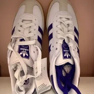 Classic Adidas Samba in white leather with blue three-stripe detailing. Low-profile design with gum rubber outsole for reliable grip. Comfortable padded collar and secure lace-up fit. A versatile casual sneaker that pairs well with everyday outfits. Big girls size 5, women’s 6.5