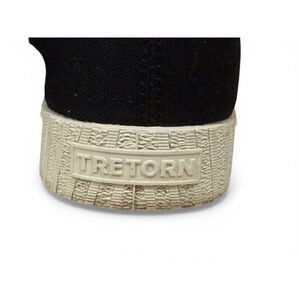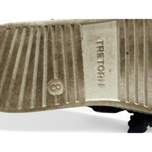These are a pair of pre-owned Tretorn Nylite Plus canvas sneakers in black with white accents, size 8. The shoes feature a black canvas upper with a white "V" shaped logo on the side. They have white laces and a textured, off-white rubber sole with "TRETORN" embossed on the heel and outsole. The insoles also display the Tretorn brand. Visible signs of wear include some dirt and scuffing on the white rubber soles and minor wear on the canvas upper. Overall good used condition