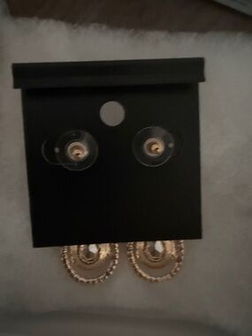 Gold-tone drop earrings with vibrant red teardrop center stones. Clear crystal pavé frames add sparkle. Classic dangle silhouette for dressy occasions.