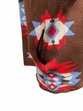 Southwestern Aztec Print Open Front Sweater Cardigan. It features a bold, multi-colored geometric pattern in shades of red, light blue, and off white set against a rich chocolate brown. It has a longline, open-front silhouette with a cozy shawl collar and long sleeves. Side pockets. Cotton acrylic blend, medium weight.
