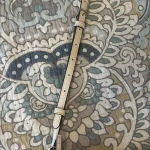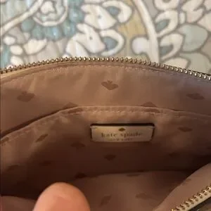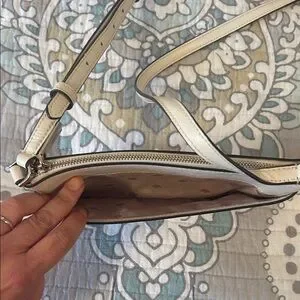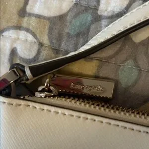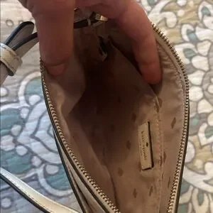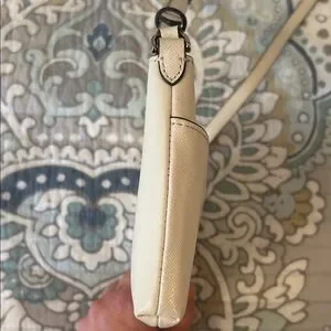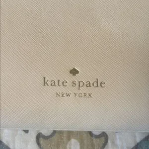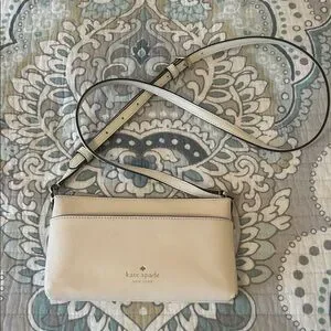 Compact cream crossbody wallet from kate spade. Smooth leather exterior with subtle logo on front. Adjustable strap for hands-free wear. Polished gold-tone hardware details.