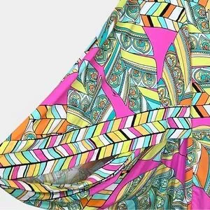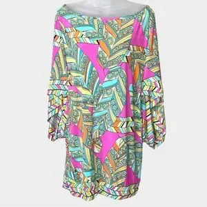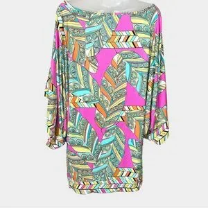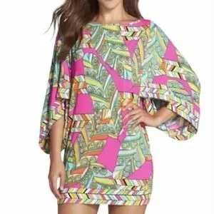 TRINA TURK vibrant geometric print tunic dress featuring bold pink, turquoise, yellow, and green tones with a retro-inspired pattern. Designed with a relaxed shift silhouette, wide statement sleeves, and a flattering above-the-knee length. Lightweight, stretchy fabric makes it comfortable and perfect for warm weather, vacations, or resort wear.