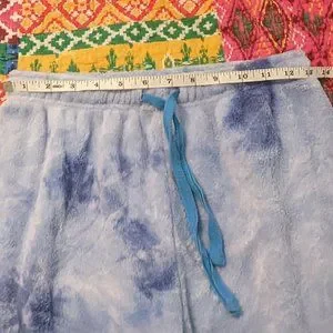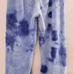 Super soft and comfy, pants are a blue tye dye pattern 100% polyester fleece. Pants have an elastic waist with a drawstring, approximately 26.5-inch inseam. These are size medium, see pics for waist measurement.