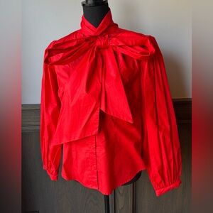 Eye-catching red blouse with an oversized tie-neck bow. Dramatic puff sleeves for a fashion-forward silhouette. Smooth, slightly lustrous fabric for a polished look. Pairs well with denim or tailored bottoms.