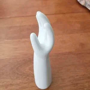 Stylish white ceramic hand display for rings and bracelets. Minimal design adds an elegant touch to any dresser or vanity. Easy to use and highlights jewelry clearly. Neutral white complements varied decor.