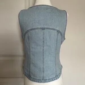 Madewell scoop neck denim button down vest in a light wash, size 4. Pit to pit measures: approx 17” length from top of shoulder is approx 19.5”, slightly longer in the Center.