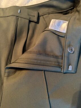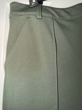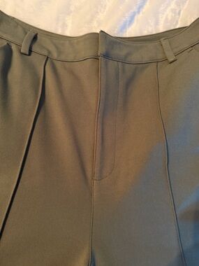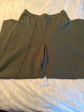 Sleek wide-leg silhouette with pressed front creases. High-rise waist for a tailored fit. Smooth drape that moves gracefully. Versatile olive tone pairs with neutrals and bold colors.