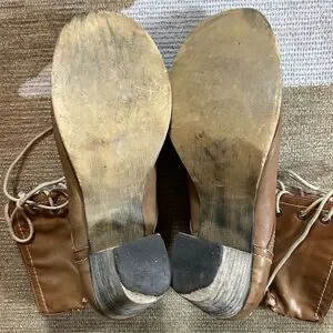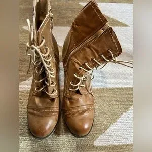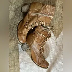 Classic tan leather lace-up ankle boots with side zipper for easy on and off. Cushioned insole and durable sole for all-day comfort. Versatile tan color pairs well with casual and dress looks. Definitely has wear and some peeling. My thought these could be used for a costume for a play or theater. I believe they are a women’s size 9 or 10.