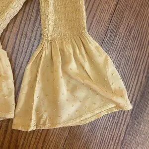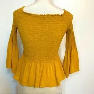 Boho cottagecore top in a warm mustard yellow. Smocked bodice, flowy bell sleeves, and a soft peplum fit with flowy dot fabric. Preowned in good condition. Women's size small.
