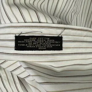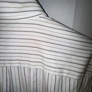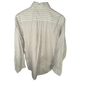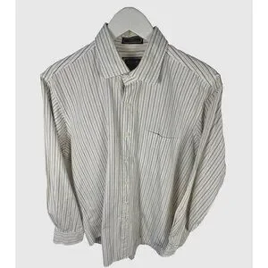 This vintage Britches of Georgetown dress shirt is a classic piece from the 90s, featuring a striped pattern in white 100% cotton material. It has a collared neckline, long sleeves with barrel cuffs, and a button closure. The shirt is a size 16.5 with a regular fit, suitable for men looking for a timeless and stylish addition to their wardrobe. Perfect for formal or casual occasions, this dress shirt exudes a sophisticated and classic look that never goes out of style.