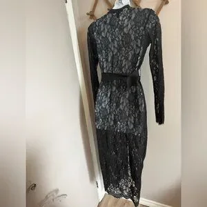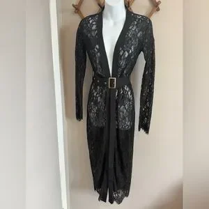 Revamped Black Floral Lace Belted Maxi Cardigan Kimono Size S