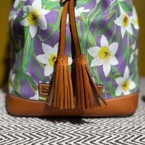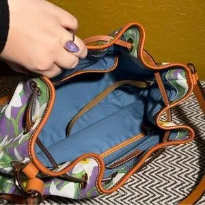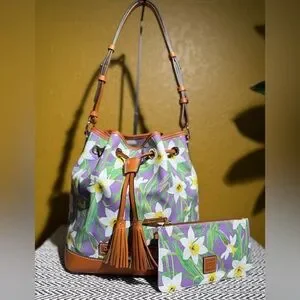 This stunning Dooney & Bourke set features the vibrant, limited-edition Botanical Daffodil print on a coated cotton body with genuine leather trim. The set includes the classic Drawstring Bucket Bag and a matching slim wristlet, offering a perfect floral pop for your spring and summer wardrobe.