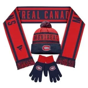 Add some winter accessories to your selection of Montreal Canadiens gear with this combo set from Fanatics. It features a scarf with woven designs, a cuffed knit hat with embroidered graphics and a pair of team-color gloves. For days when the temperature dictates your outfit, be sure you're able to keep warm without sacrificing your Montreal Canadiens loyalty.
