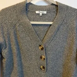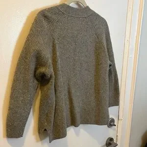 Soft ribbed knit with a V-neckline. Three large front buttons. Relaxed fit with side slits. Versatile layer for cool days. 60% Merino wool, barely worn in mint condition