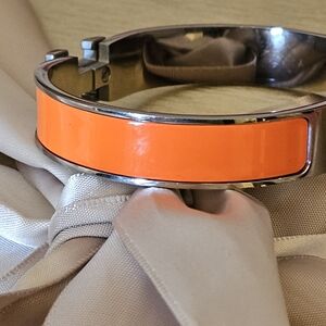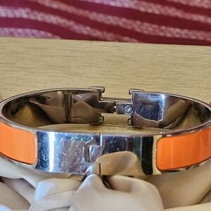 Hermes enamel bracelet with bold orange panels. Shiny silver hardware and H clasp. Sleek and iconic design. Easy to wear and stack.no return