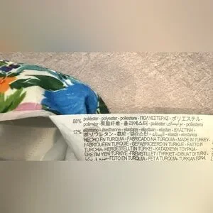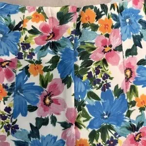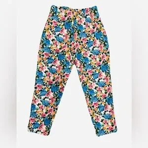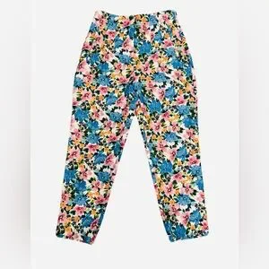 Front zip light taper floral Zara pants. The photo on model makes them look like athletic pants- but they are more dressy probably- could wear with black heels if you want. Lovely floral pattern. Could fit cropped and it would look intentional- or longer as well. Decorative triangle notch at back. Pleat-like flat seams at waistband and button. Listed as L, but probably fit a medium better. Please ask for measurements if interested. These are a quick post.