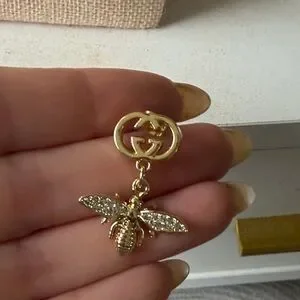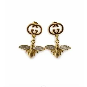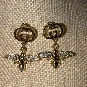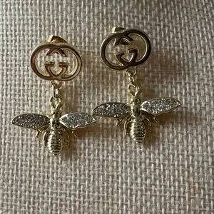 Elegant GUCCI gold-tone bee drop earrings. Sparkling crystal-accented wings add refined shine. Classic GG logo top for designer recognition. Lightweight, eye-catching style for day or evening wear.