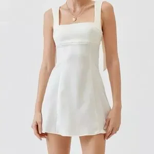 Sweet mini dress with square neckline. Wide shoulder straps tie into bows. Smooth, slightly flared skirt for easy movement. Minimal, feminine look perfect for warm days or date nights.