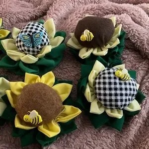 Each piece features a soft, stuffed center set in layered fabric “petals,” with an adorable bee (and one with a butterfly!) accent for a cheerful touch 🐝🦋