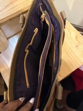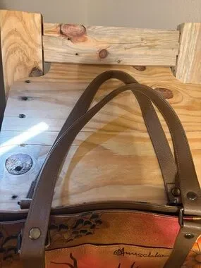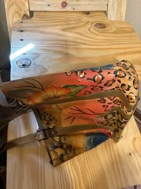 Beautiful Excellent Condition, Stylish hand-painted leather tote featuring vibrant multicolor floral artwork. Durable brown leather straps and trim for comfortable carrying. Eye-catching orange, green, blue, and tan tones enhance outfits. Functional interior for everyday use. A unique statement bag with artisanal detailing. All Sales Final 🤎