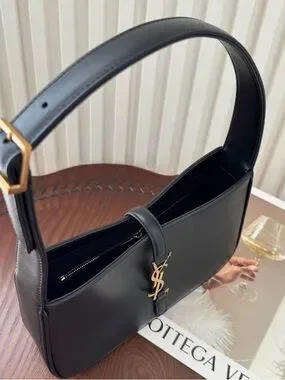 Elegant black leather shoulder bag by Yves Saint Laurent. Smooth finish with prominent gold YSL emblem. Slim strap and refined silhouette. Timeless, luxe accessory.