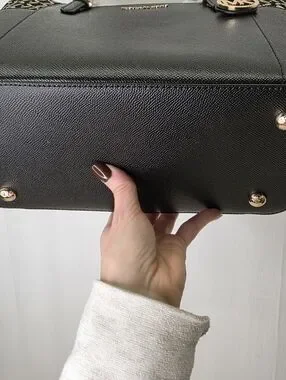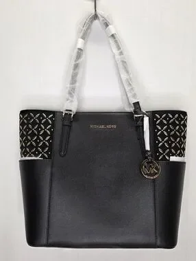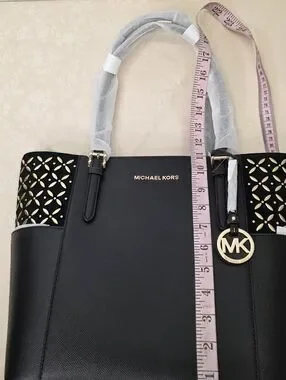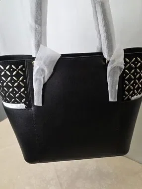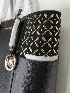 Brand new with tags! This Michael Kors Charlotte Large Tote is the perfect blend of classic and edgy. Crafted from durable black Saffiano leather, it features unique gold-tone floral eyelet/studded detailing on the side pockets that really catches the light.
