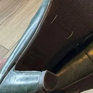 Elegant Miz Mooz leather heels in deep green. Unique cutout and button detail across the vamp. Rounded toe with a sturdy mid heel. Back zipper for easy on and off. Classic and versatile style.