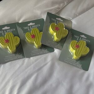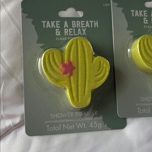 Cactus-shaped shower steamers. Bright lime green color with a small pink flower accent. Individually packaged. Fun, fragrant shower accessory. 5 for the price of one