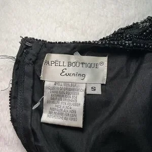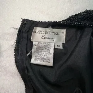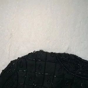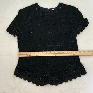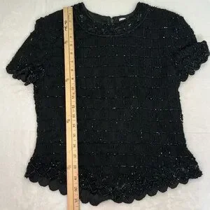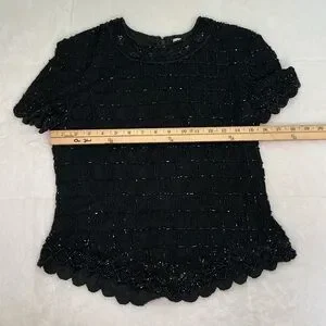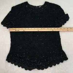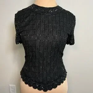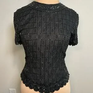 Elegant black short sleeve top with intricate beadwork and textured grid pattern. Scalloped hem and neckline add refined detail. Lightweight, dressy silhouette perfect for evening wear. Includes black bead embellishments for subtle sparkle. In good used condition but a couple treads coming undone, please see pictures for details