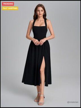 A romantic and flowy sundress featuring a halter neck with buttons, a smocked back, and a statement bow tie. The A-line silhouette with a split hem offers a charming and feminine look perfect for special occasions.