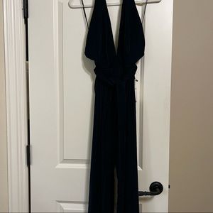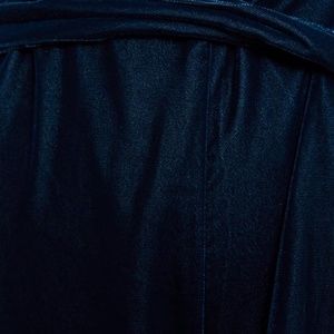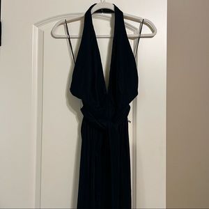 Sleeveless halter neckline with deep V. Velvet fabric with a draped tie waist. Wide-leg silhouette for an elegant look. Rich, dark teal tone.