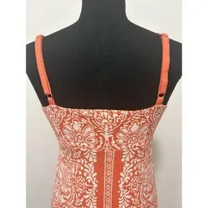 Pre-owned Tommy Bahama dress in size XS/TP. Orange and white floral/medallion style print with spaghetti straps, adjustable straps, empire waist, and front tie detail. Lightweight 100% cotton fabric with an easy resort/beach feel. Great for vacation, summer, casual wear, or a cover-up style look. In good pre-owned condition with normal light wear. Please see photos for details and overall condition.