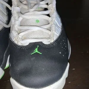 The Nike Air Jordan 6 Rings GS Basketball Shoes 323419-130 in White and Green, size 4Y, are designed for boys who enjoy basketball and need a comfortable and supportive shoe. Featuring a hook & loop closure, cushioned insole, and adjustable strap, these sneakers offer a secure fit for active kids. The rubber outsole provides traction, making them suitable for various seasons and occasions. With the iconic Jordan logo as accents, these athletic shoes are part of the Nike Air product line, ensuring quality and style for young sneaker enthusiasts.