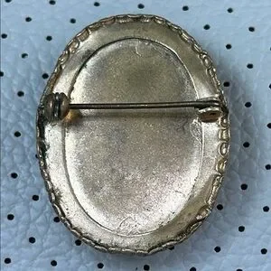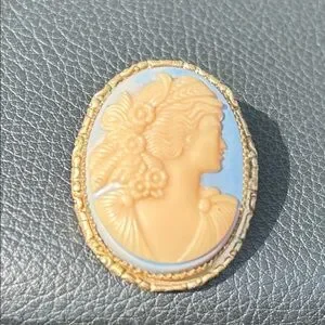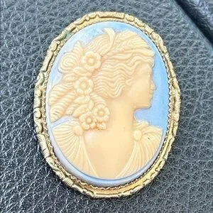 Vintage blue and cream cameo brooch with a classic profile design. Features a detailed cream-colored relief set against a soft blue background with a beautiful detailed brass setting. Versatile piece that adds vintage charm to any outfit.