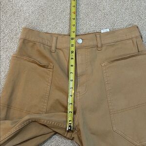 High-rise wide leg pants in a khaki tone. Utility front patch pockets and seam detailing. Clean, versatile silhouette for everyday wear. Zip fly. 98% organic cotton, 2% elastane