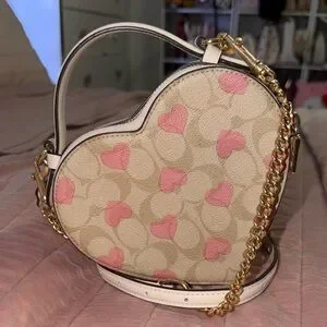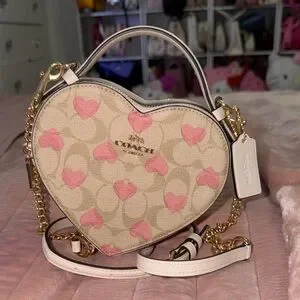 Heart-shaped Coach mini crossbody with signature logo. Beige canvas body with pink heart accents. Gold-tone hardware and chain strap details. Removable strap for shoulder or crossbody wear.