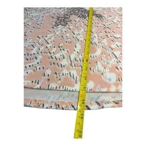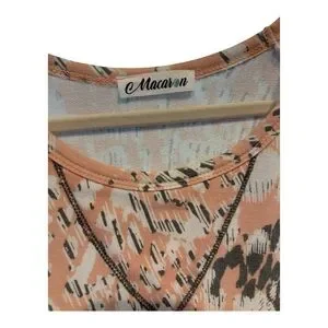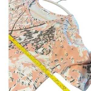 Lightweight short-sleeve top with a soft peach base. White abstract print scattered across the front. Rounded neckline and relaxed fit. Easy everyday style with a subtle pattern. No size tag see measurements.