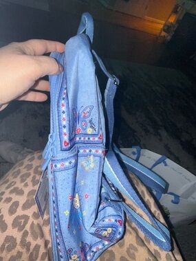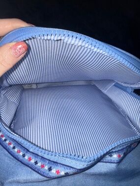 Light blue striped interior with coordinating trim. Soft fabric lining and zip top. Compact pouch for small essentials.