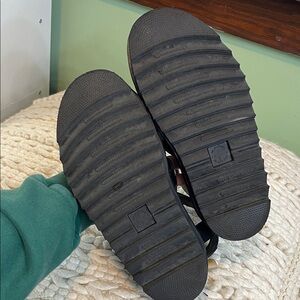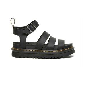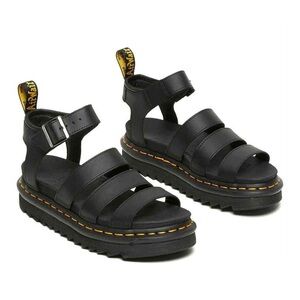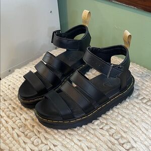 Dr. Martens Black Leather Strappy Platform Sandals with Yellow Stitching