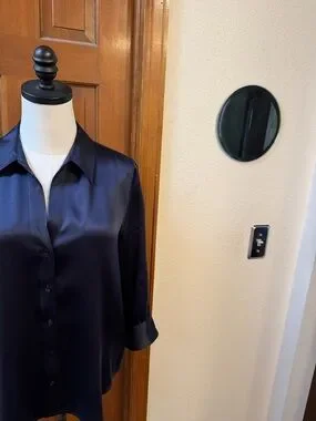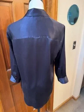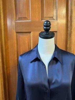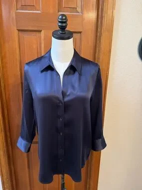 Luxurious navy silk button-down with a classic collar. Soft sheen fabric and smooth drape. Three-quarter sleeves with subtle cuff. Versatile polished top for day or evening. In good condition.
