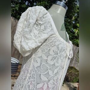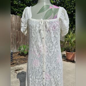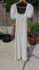 This elegant dress features a unique knotted round neckline and charming short, puffed sleeves. A comfortable inner lining ensures a smooth and flattering fit. The front closure is adorned with delicate buttons. Its pristine white color exudes sophistication and timeless style. This piece is a perfect addition to any wardrobe.