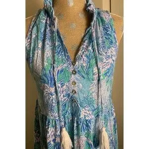 The Lily Pulitzer Malone Maxi Dress in Las Olas Aqua is a vibrant and stylish option for a vacation, resort, or beach ensemble. With a sleeveless design, V-neckline, and pullover closure, this dress is perfect for casual occasions. Made of comfortable cotton jersey fabric with tasseled accents, the multicolor pattern of the Current Sea adds a touch of tropical flair to your wardrobe. The long A-line silhouette and Lilly Pulitzer brand make this dress a versatile choice for all seasons, whether you're looking for a winter getaway or a summer retreat.