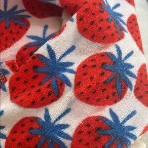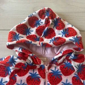 Soft hooded swim coverup with full front zipper. Playful strawberry print. Lightweight and easy to wear. Perfect for pool or beach days. Front side pockets. Size 120 fits 6-7 years. 80% cotton and 20% polyester. There are some minor color bleed spots on arm - see last photo. Blends in with coverup.