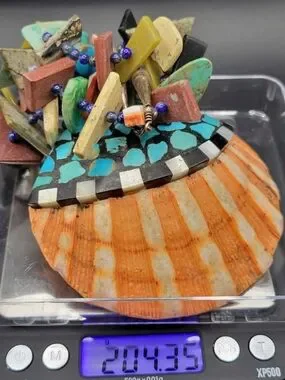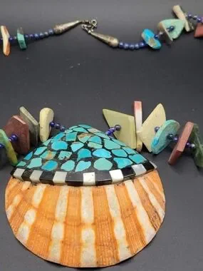 Bold statement necklace featuring turquoise mosaic inlay and an orange shell pendant. Multicolored stone accents add artisanal character. Beautiful work by Santo Domingo artisans.