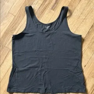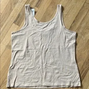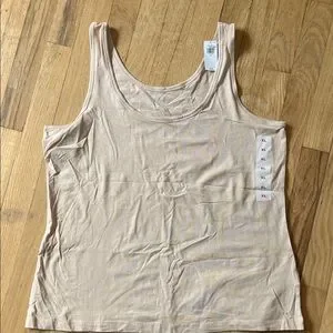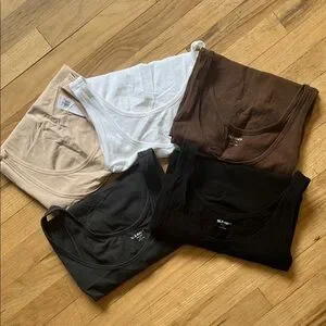 Five first layer tank tops from Old Navy. Soft stretch fabric. Classic scoop neck. Neutral color mix for easy pairing. Visible Old Navy branding on tags. Beige tank is NWT. The others are like new.