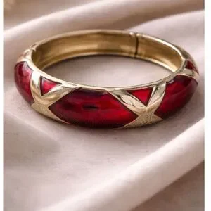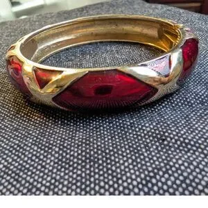 Bold vintage 1980s hinged bangle bracelet featuring rich red molded glass panels set into a sculptural gold tone frame. The glass inlay creates depth and glow, catching the light beautifully while delivering that iconic chunky 80s statement look. A standout accessory that pairs effortlessly with both casual and elevated outfits. Easy to wear with a secure hinged closure.