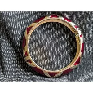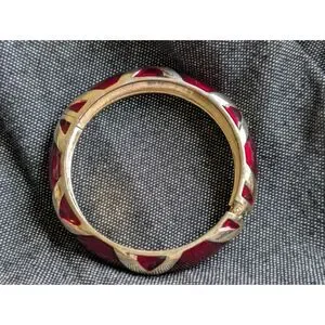 Vintage 80s Red Glass Panel Gold Tone Hinged Bangle Bold Statement