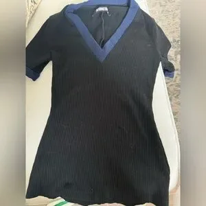 This sleek fitted tee from Reformation is crafted in a classic black with subtle blue neckline trim. Its form-fitting silhouette makes it a versatile addition to any wardrobe, perfect for both casual and dressy occasions.