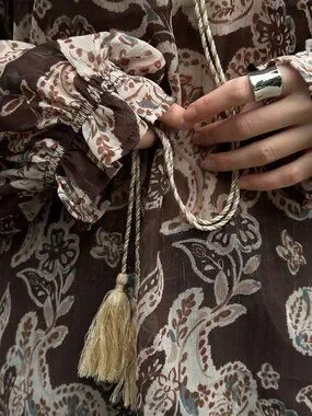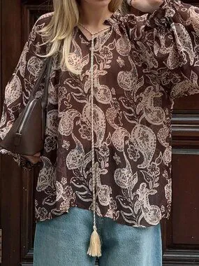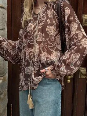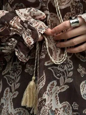 Embrace a relaxed island vibe with this coffee brown boho shirt featuring a playful cashew flower print. The oversized silhouette drapes comfortably, while the long length and regular hem add effortless flow. A classic collar neckline pairs with flounce sleeves that bring a touch of movement to every step.
