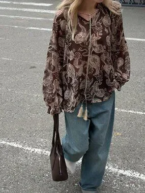 Coffee Brown Boho Women's Cashew Flower Print Shirt